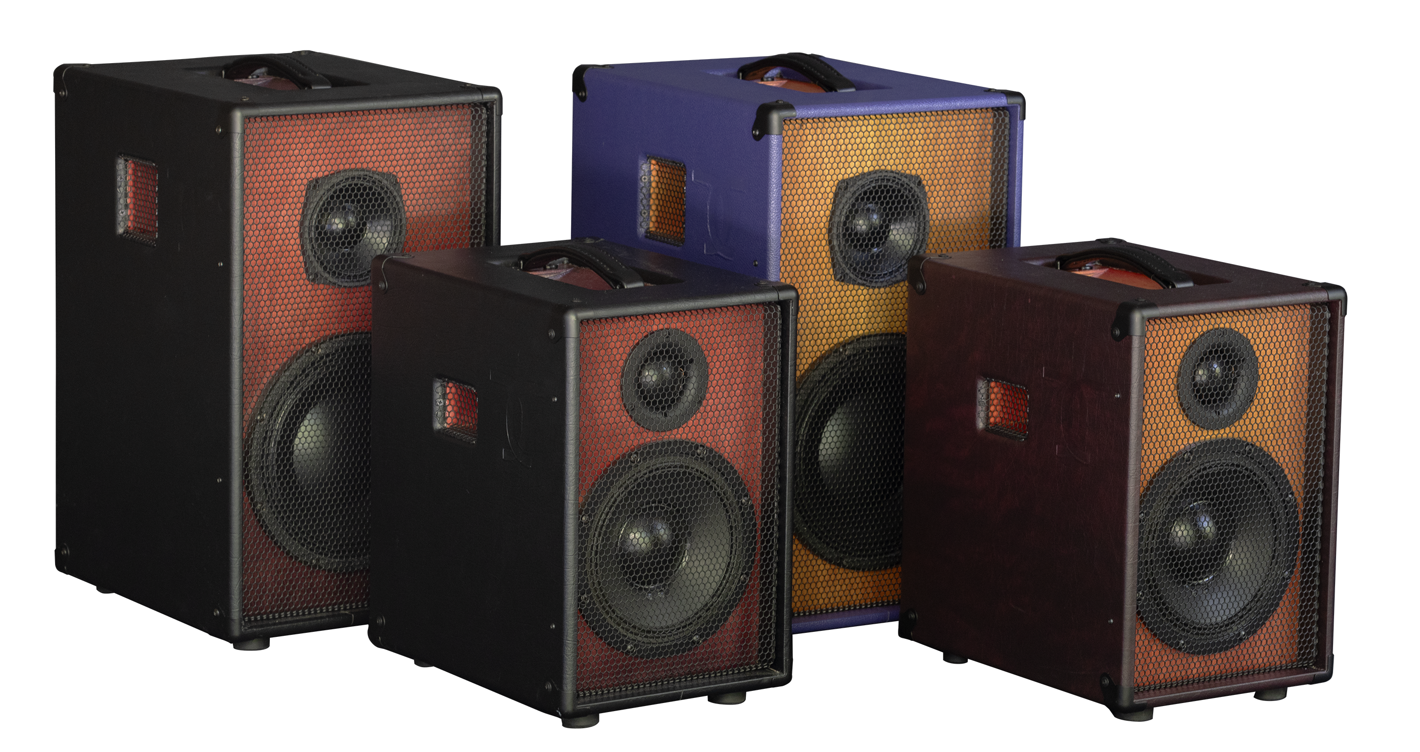• Color flows and fades under the surface — on the baffle front, within the vent interiors, and under the dished handle. Transparent dyes are used, like on clear-finished basses, with up to 7 coats of acrylic clear coat.